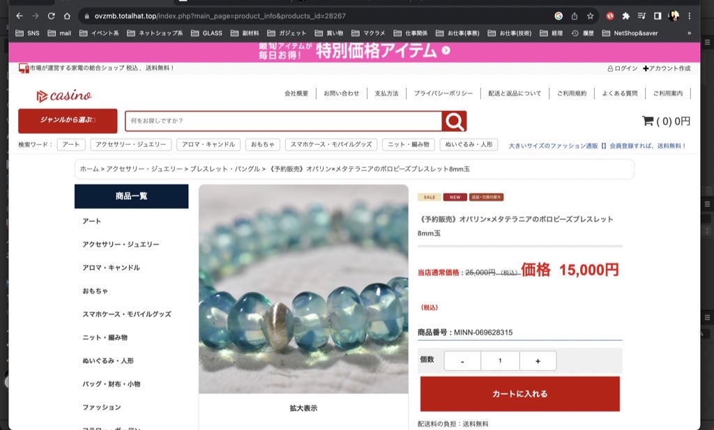 過去に制作した「オパリン×メタテラニア」のボロビーズブレスレットを販売する詐欺サイト(偽物ECサイト)を発見しました。